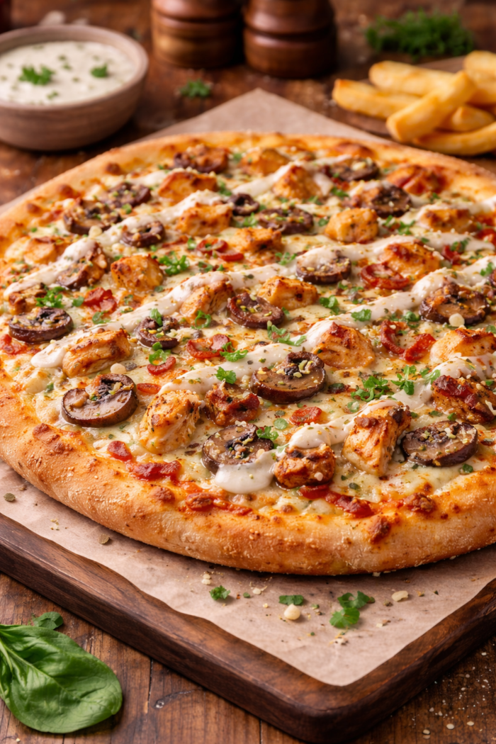 Layered with melted mozzarella and often complemented by toppings like grilled chicken, mushrooms, or fresh herbs, this pizza creates a perfect balance of creaminess and flavour. The combination of cheeses adds depth, while the creamy sauce brings a comforting, indulgent taste experience.