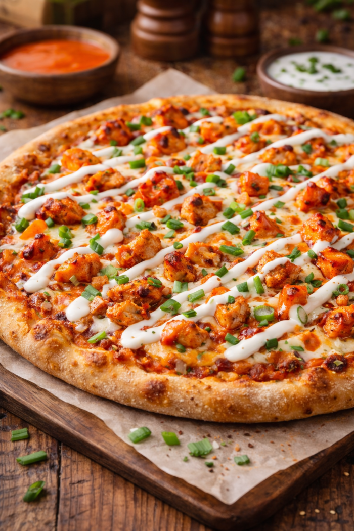 Buffalo chicken pizza is known for combining the classic taste of buffalo wings with cheesy pizza, creating a balance of spicy, creamy, and savoury flavours. Fresh toppings like onions or green herbs enhance the texture and freshness, making each slice irresistible.