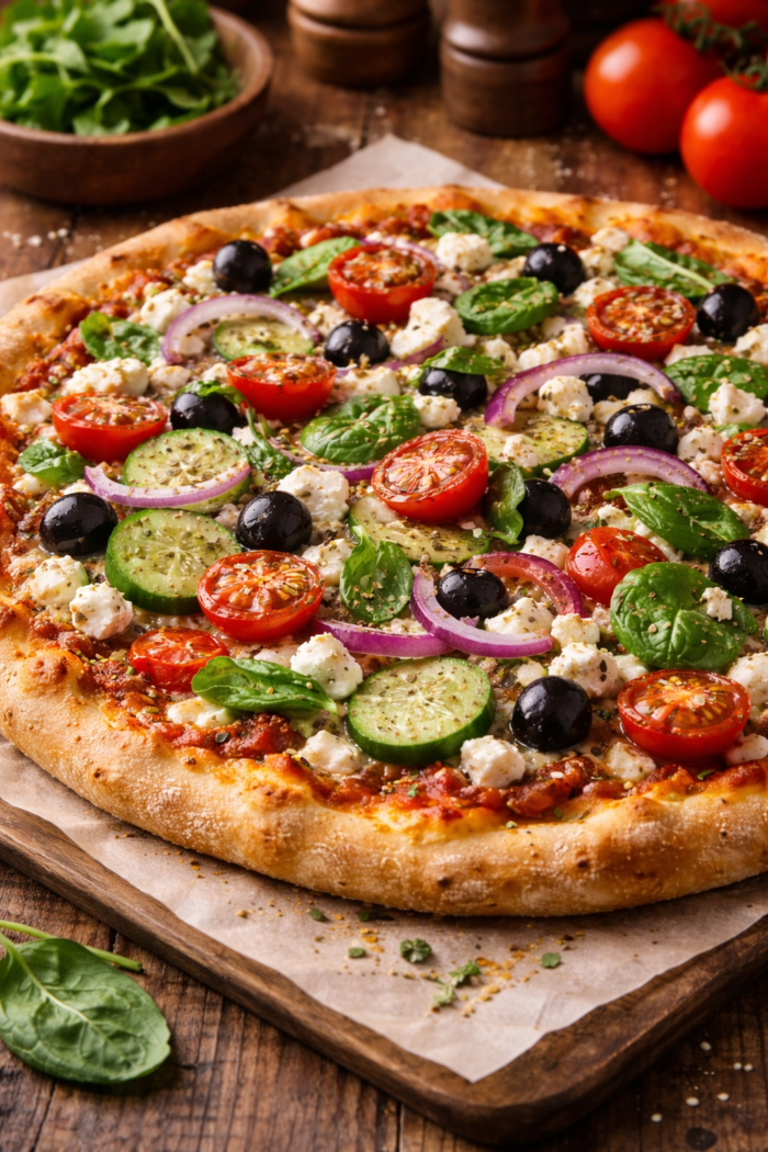 Indulge in a Mediterranean-inspired delight with the Greek Style Pizza at Peachy Pub and Grill. This flavourful pizza is crafted on a perfectly baked crust, lightly infused with olive oil for a rich and aromatic base. Topped with a delicious blend of tangy feta cheese, melted mozzarella, juicy tomatoes, olives, and fresh vegetables, every bite delivers a refreshing balance of textures and bold taste. Greek-style pizza is known for its vibrant ingredients like olives, onions, spinach, and herbs such as oregano, which bring a distinct and wholesome flavour profile.